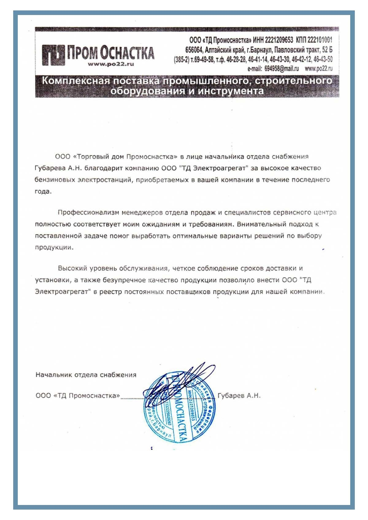 Завод «Торговый дом Промостнастка» в лице начальника отдела снабжения Губарева А.Н. благодарит завод«ТД Электроагрегат» за высокое качество бензиновых электростанций, приобретаемых в вашей компании в течение последнего года.