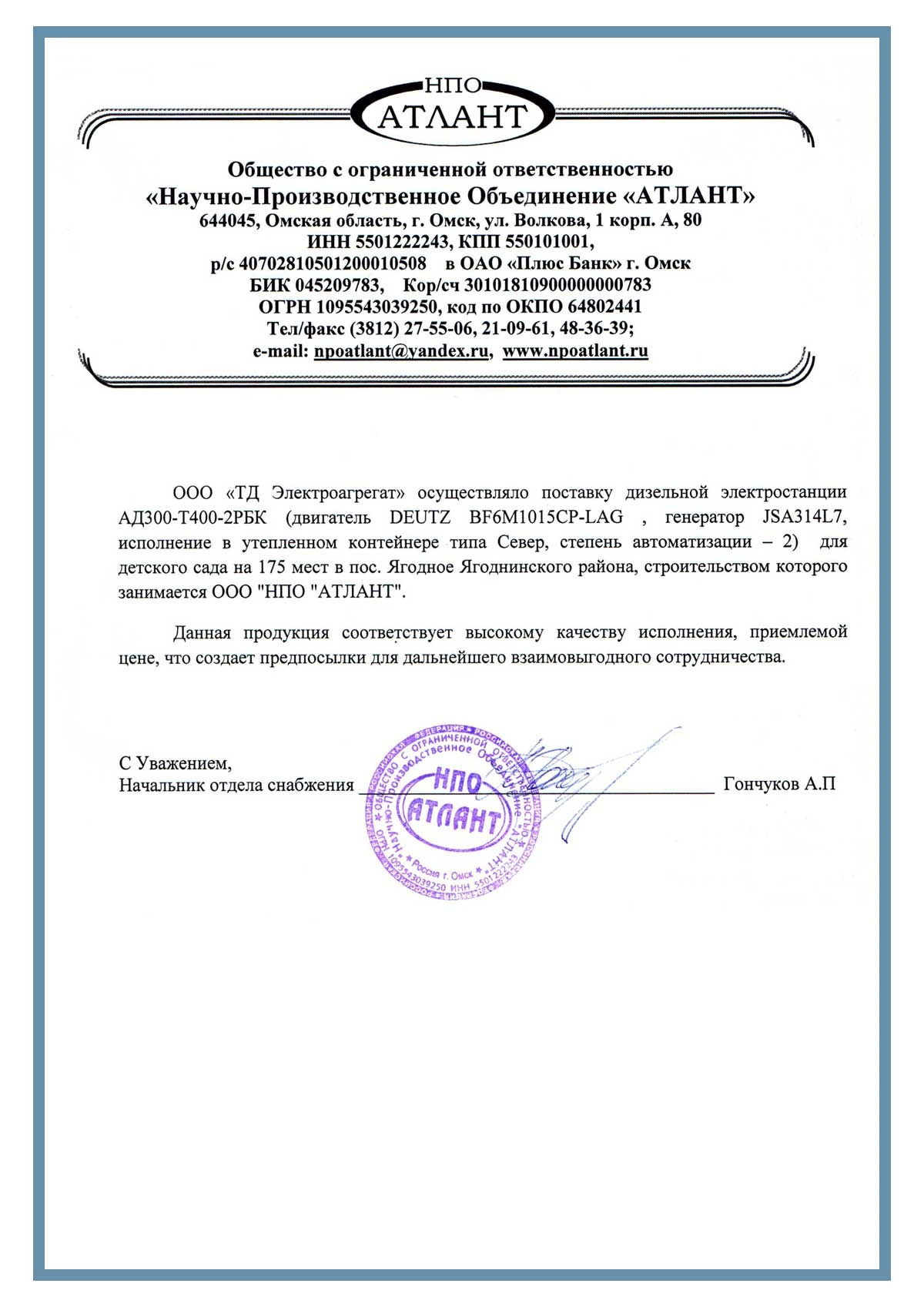 Отзыв контрагентов о компании ООО «ТД Электроагрегат» и  исполненном проекте для Отзыв ООО "НПО АТЛАНТ" г. Омск